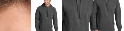 9.5-ounce, 80/20 ring spun cotton/poly Soft-washed, garment-dyed fabric Jersey-lined hood with drawcord Rolled forward shoulder Back patch Twill-taped back neck Twill label Side seamed Pouch pocket 1x1 rib knit on cuffs and hem Double-needle armholes, cuffs and hem